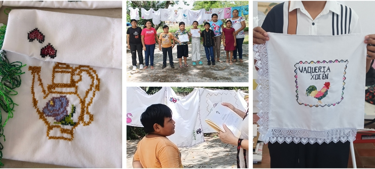 Durante el curso, los participantes elaboraron su propia prenda de un pañuelo y servilletas para empezar inducirse al xooc Chuy trabajando una blusita y los niños los bordes de una camisa. El xooc chuy, es una técnica de bordado maya, también conocida como punto de cruz o "hilo contado", una pieza tradicional que refleja la riqueza cultural de Yucatán. Este proceso fue posible gracias al acompañamiento cercano de maestras de las comunidades, quienes transmitieron sus conocimientos con dedicación y compromiso.